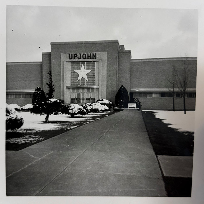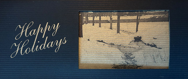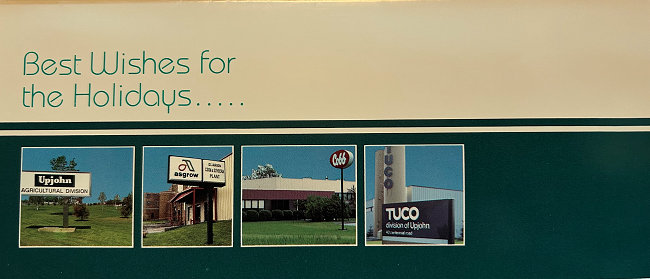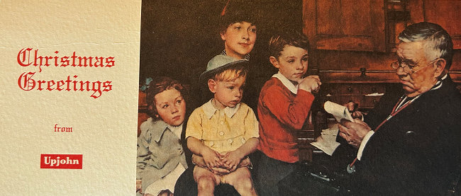 the Christmas Bonus section from the employee handbook and a selection of Upjohn Christmas cards that the bonus check