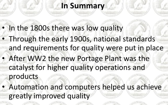 Another good surprise was the Building 259 large conference room had been completely refurbished recently. It looked really nice. New technology had been added so presentations given there could also be experienced in remote conference rooms. An a/v technician was on hand. There were many blowups of historic site photos being displayed. Many of my friends and co-workers still at Pfizer showed up and it was wonderful to see their faces again. I covered the quality journey from when The Upjohn Pill & Granule Company opened in 1886 up to the 1990s. Here’s a link to my presentation in pdf format and below is my final slide.