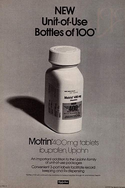 I would say that Motrin was the first blockbuster product for The Upjohn Company in the modern era. The chemical name for Motrin is Ibuprofen. It is an NSAID (Nonsteroidal Anti-Inflammatory Drug) that is used primarily to treat fever, mild to moderate pain (including pain relief after surgery), painful menstruation, osteoarthritis, dental pain, headaches, and pain from kidney stones. It may be that just about everyone in a first or second world country has by now used Ibuprofen at some point in their lives.