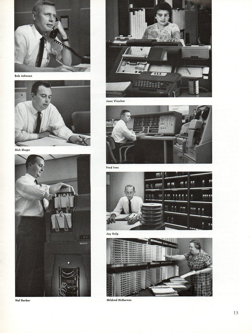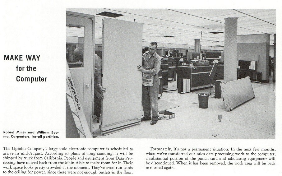 Automation of Upjohn sales numbers began in 1924 using Comptometers, which were large, mechanical adding machines. By 1955, electronic billing for sales and data processing for other areas was possible using punch cards and IBM Cardatype machines. In 1957, plans were being made to install the first mainframe computer. A Burroughs 220 computer was selected and a computer room built in the basement of Building 41 in Portage. The Burroughs cost a million dollars to lease and required a full-time engineer from the manufacturer to be on site. This computer did not have transistors on printed circuit boards. It used vacuum tubes. Installation was completed in Building 41 on October 12, 1959. There were a number of articles about the Burroughs in Upjohn News from 1957 through 1962. I've included them below in chronological order. By 1962, plans had been made to replace the Burroughs with IBM 1401 and IBM 1410 mainframes. These new machines were 2 and 1/2 times faster, the lease was $84,000 a year less and they did not require an on-site engineer. There were no vacuum tubes in them and they required programming in a different language. The Burroughs was retired in 1963.