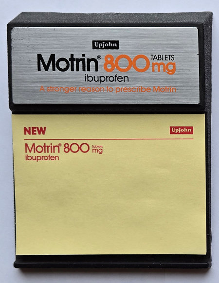 I would say that Motrin was the first blockbuster product for The Upjohn Company in the modern era. The chemical name for Motrin is Ibuprofen. It is an NSAID (Nonsteroidal Anti-Inflammatory Drug) that is used primarily to treat fever, mild to moderate pain (including pain relief after surgery), painful menstruation, osteoarthritis, dental pain, headaches, and pain from kidney stones. It may be that just about everyone in a first or second world country has by now used Ibuprofen at some point in their lives.