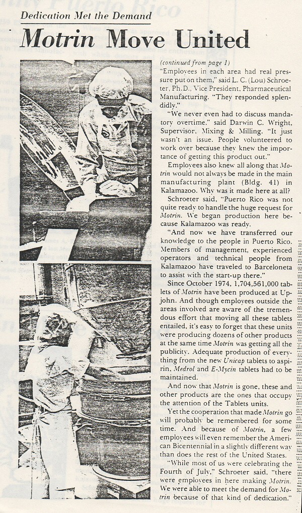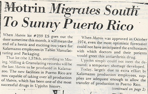 Ibuprofen was discovered in 1961 in Nottingham, UK, by Stewart Adams and John Nicholson while working at Boots the Chemists. In 1969 it was first sold in the UK using the product name Brufen. Upjohn bought the rights to sell it in the USA and other countries from Boots. They got a 300 mg and 400 mg coated tablet approved by FDA and on sale in the USA in 1974, using the product name Motrin. The large sales volume of Motrin was a pleasant surprise to the company. It was initally made in Building 41, Portage but moved to the Upjohn Puerto Rico plant, then called the Upjohn Manufacturing Company-M, and that plant ran at full-capacity.